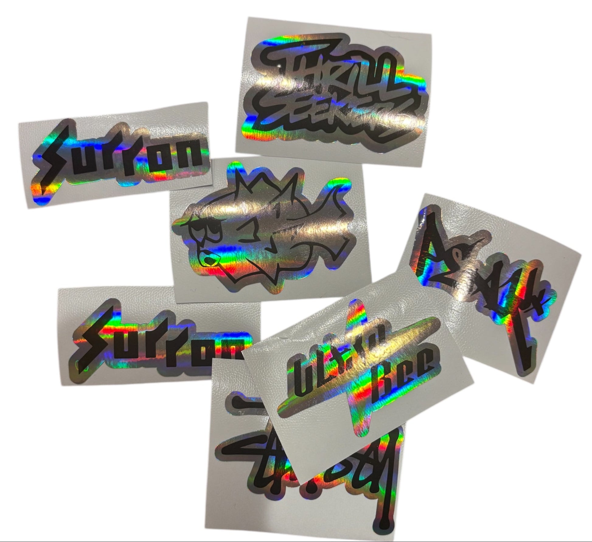 Style A: SurRon, UltraBee, Studdy, Thrill Seekers, Prickly, and Peak — all in a bold, ride-ready classic 3" sticker style.